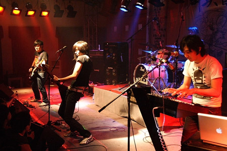 新褲子楽隊 2008年11月9日、天津第三届原創音楽季 群英会より。左から:杜瑋・彭磊・龐寛・徳恒。(写真提供:顔東)
