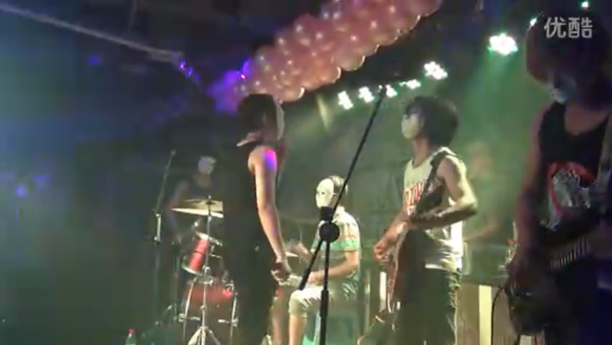 七号禁区楽隊 2012年のライブ。ライブ開始時にはメンバーはみなお面を被っていたが、歌のパートがスタートするとお面を取ってしまった。(写真:宜宾-七号禁区原创作品、ybwx2008、优酷)