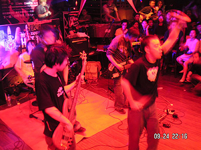 | 重慶のバンド。前身のバンドは枯萎的倒影楽隊。2003年に改名した。メンバーはリーダーの余思成(G)ほか。音楽スタイルはニューメタル。 2003年前半のメンバーは、林佳(Vo)・劉浪(元・THE BUS楽隊)(G)・余思成(G)・咸江(B)・張靜莎(元・窗戸上的女妖楽隊)(Dr)。4月6日、沙坪[土貝]芸念酒[ロ巴]で行われた“記念Kurt Cobain(nirvana)、Layne Staley(Alice In Chians)”ライブに参加した。5月4日、沙坪[土貝]芸念酒[ロ巴]でライブを行った。6月15日、帰来酒[ロ巴]で行われた繁殖楽隊結成2周年記念ライブに参加した。7月5日、木船[ロ巴]でライブを行った。10月12日、海洋公園で行われた“重慶長江流揺滾音楽節”にAK47楽隊と共に参加した。11月29日、木船LIVEHOUSEで行われた造音異代網周年記念ライブに参加した。この時、ドラムはカナダ人が担当した。12月26日、労働人民文化宮で行われた“渝報三周年慶狂歓活動”に出演した。 |