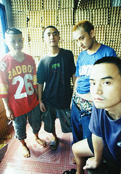| 湖南省長沙のバンド。2000年3月結成。メンバーは、肖煕攘(別名:肖波)(Vo)・王棟(G)・楊豐収(別名:楊天橋)(就這様楽隊)(B)・周威(別名:周肥沃)(Dr)。音楽スタイルは、ラップメタル。3月29日、小戴[ロ巴]で初めてライブを行った。4月6日、湘潭の城市快車酒[ロ巴]で拆楽隊・疫楽隊・交響樂團・ABC楽隊と共にライブを行った。5月19日、桂林の插電[ロ巴]でライブを行った。6月10日、湘潭の城市快車酒[ロ巴]でライブを行った。9月には、靈前三分鐘楽隊とともに、インディーズスプリットアルバム『漁‐‐3』を製作した。同月、靈前三分鐘楽隊とともに漁湾市藝術團を結成した。10月、小戴[ロ巴]でANARCHY BOYSと共にライブを行った。10月28日には、靈前三分鐘楽隊とともに武漢の新人類[ロ巴]でライブを行う。この時、肖波は素っ裸で曲を歌っていた。 同月、王棟はカナダ留学のためにバンドを脱退する。やがて、阿笛(Vo)が加入し、肖波がギターリストとなる。しかし12月、王磊石(G)が新たに加入し、肖波はボーカルに復帰した。どうやら、阿笛は脱退したようだ。 2001年3月になり、インディーズアルバム『厳資ナ撃Xing事犯罪』を製作した。2月24日、小戴[ロ巴]でライブを行った。3月4日、湘潭の6路車酒[ロ巴]でライブを行った。4月初には活動の拠点を北京に移し、ライブを数回行ったが、相次いで問題が発生してしまい、同月には解散してしまった。 |