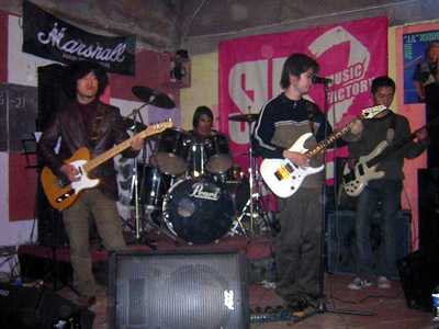 | 上海のバンド。2003年夏結成。メンバーは[龍/共]R(Vo&リズムG)・悉順(リードG)・陶堅亮(Dr)で、上海体育学韵の学生によって構成されている。音楽スタイルはブリティッシュロック。間もなくして、王崢(B)が加入し、4人となった。10月、森林公園で行われた“十一狂歓夜”に参加した。これが初ライブであった。11月、挂二音楽工場主催の大学ライブに参加した。 2004年2月21日、挂二音楽工場でライブを行った。同年前半、王崢が脱退した。3月18日、松江大学城文匯路学子縁門前広場でライブを行った。この時、曹勇(元・撲楽隊)(B)がサポートを務めた。その後、小金(B)が加入した。4月15日、上海第二医科大学で行われた“2004上海之春国際音楽節−−校園音楽先鋒初賽”に参加した。4月19日、復旦大学南区生活中心でライブを行った。4月20日、上海理工医療器械学院でライブを行った。6月3日、華東理工大学礼堂で行われた“弦外之音−−献給孩子的音符公益演出”に参加した。8月、悉順はバンドを脱退した。8月7日、部落人酒[ロ巴]でライブを行った。この時から、張曉傑(リードG)が加入した。このライブを最後に、小金がフランスに留学することになり、バンドを脱退した。この後、王引(B)が加入した。9月15日、上海交通大学閔行校区の菁菁広場でライブを行った。10月18日、一土抱石主題酒[ロ巴]でライブを行った。王引はやがてVENUS楽隊のライブに参加するようになり、バンドを離れていった。 |