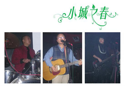 | 石家庄のバンド。メンバーは小強(Vo&G)・寧寧(女性)(B)・大國(Dr)。音楽スタイルはブリティッシュやパンク、フォークが融合したものである。 2007年12月16日、地下絲絨酒[ロ巴]でライブを行った。12月23日、地下絲絨酒[ロ巴]でライブを行った。 2008年1月13日、地下絲絨酒[ロ巴]でライブを行った。2月24日、地下絲絨酒[ロ巴]でライブを行った。3月9日、地下絲絨酒[ロ巴]で行われた食草堂&相對論楽隊の1stEP発表会に参加した。3月14日、地下絲絨酒[ロ巴]で行われた後海大鯊魚楽隊のライブの前座を務めた。3月18日、地下絲絨酒[ロ巴]でアンプラグドライブを行った。4月9日、石家庄華医学院で行われた“GIBSON弾唱夢想全国巡回演出石家庄站”に参加した。4月20日、地下絲絨酒[ロ巴]でライブを行った。5月17日、河北省博物館広場で行われた[シ文]川大地震被災者チャリティライブに参加した。6月15日、太平洋広場で行われた“石家庄第六届揺滾音楽節”に参加した。7月12日、北京の豪運酒[ロ巴]でライブを行った。7月13日、北京の疆進酒酒[ロ巴]でライブを行った。9月7日、地下絲絨酒[ロ巴]でライブを行った。11月29日、北京の豪運酒[ロ巴]でライブを行った。 |