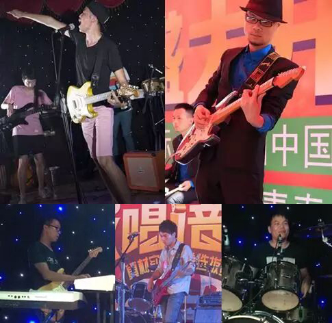 白丁重啓楽隊 2015年の写真。左上から:大鵬・阿軍。左下から:小五・阿茂・阿華。(写真:【万圣趴+音乐现场】万圣节爬梯“阴谋秘上”,斗胆你就来上当,多个乐队助阵~、DODO、DoDo Live House)
