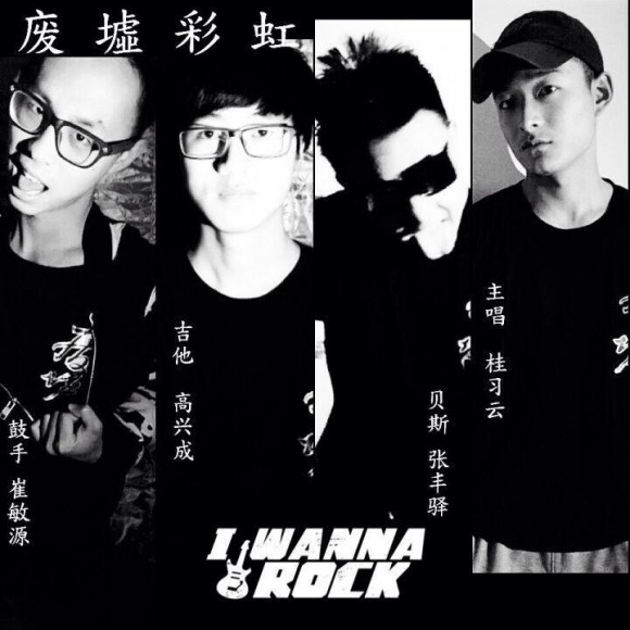 廃墟彩虹楽隊 2014年の写真。左から:崔敏源・高興成・張豊駅・桂習雲。(写真:《回声音乐节》来自吉林建筑大学的“废墟彩虹"乐队!!!、酷我音协、吉林建筑大学吧)