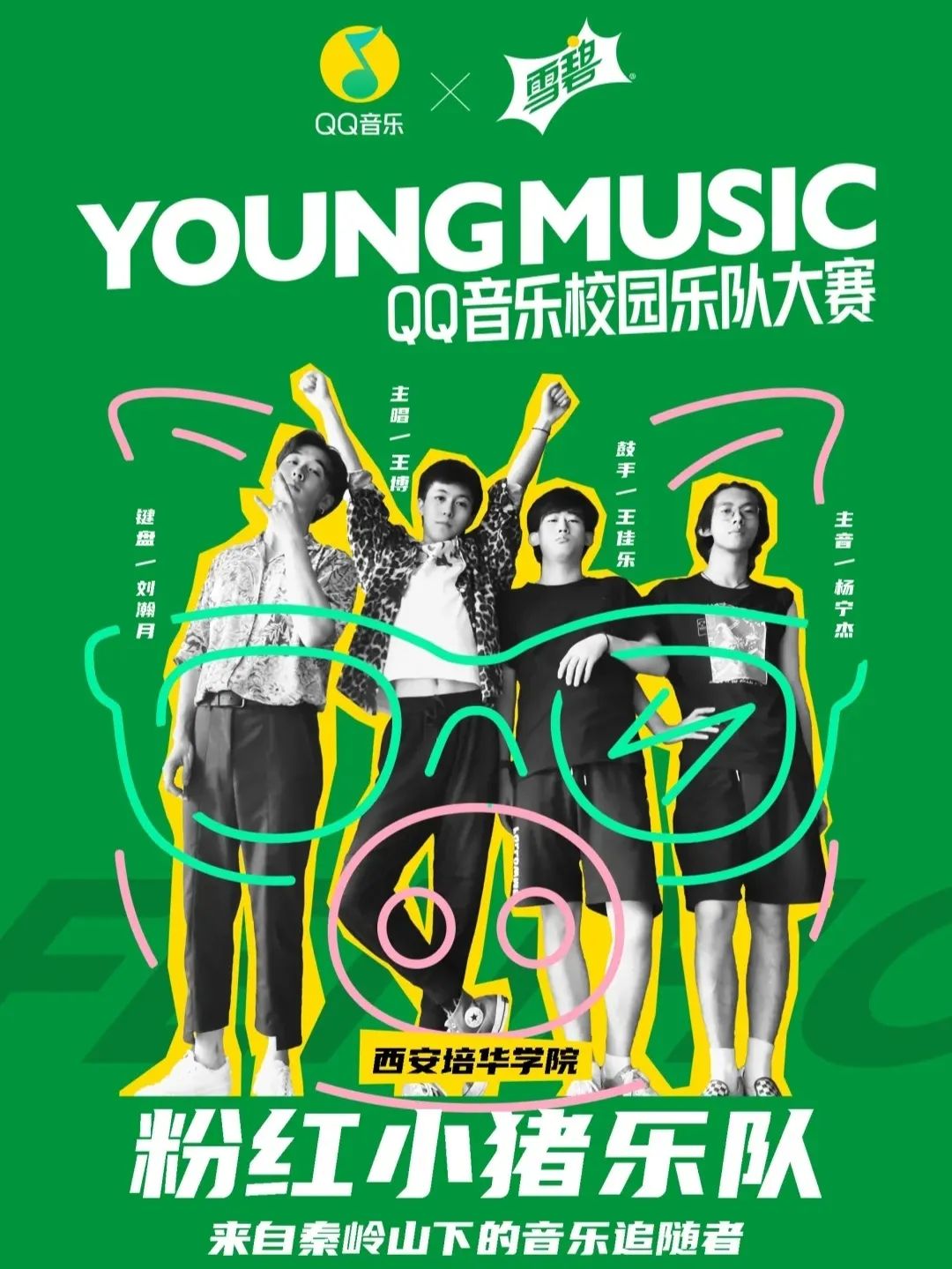 粉紅小猪楽隊(西安市) 2020年、YOUNGMUSIC QQ音楽校園楽隊大賽出演時のポスターより。(写真:校园乐队狂欢夜 | YOUNG MUSIC YOUNG HEART QQ音乐校园人气乐队来啦!、校园酱、QQ音乐校园)