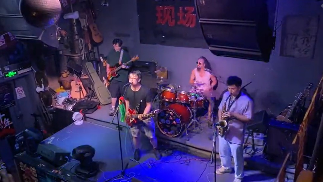 尬楽隊 2021年8月28日のライブ。(写真:尬乐队昨晚在上海现场酒吧16周年庆典上开场演出!#架子鼓 #摇滚、西瓜视频、鼓手演员大圣孙明振)
