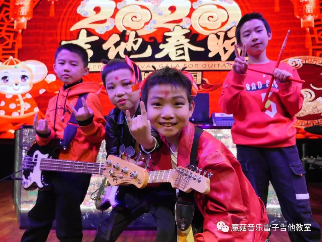 哪吒楽隊(阿克蘇市) 2020年1月の写真。(写真:你能想到这是阿克苏的少儿乐队吗?太厉害了吧!、雷子吉他教室、魔菇音乐雷子吉他教室)