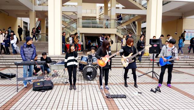 藍糖楽隊 2015年3月16日のライブ。左から:陳蕭燊・朱均悦・張宇馨・杜雨明・陸穎至・朱培尭。(写真:自由音乐社 · 春季路演图片回顾、X自由音乐社)